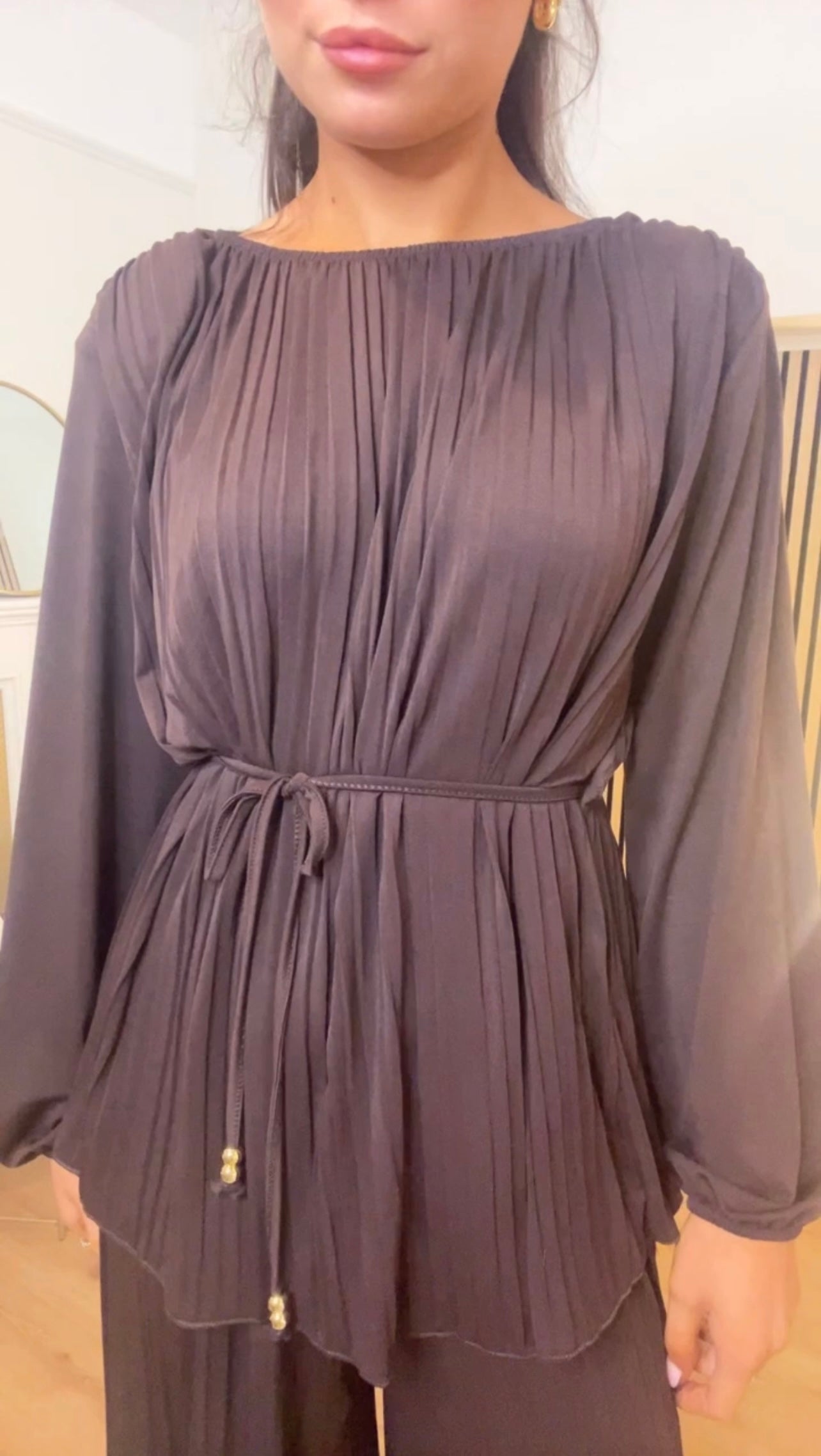 Chocolate brown soft stretch pleated 2 piece - elevated dressy comfort - round neck top with shoulder pads to add to the flattering fit, tie belt with gold bead detail, trousers are soft full pleated with elastic waist
