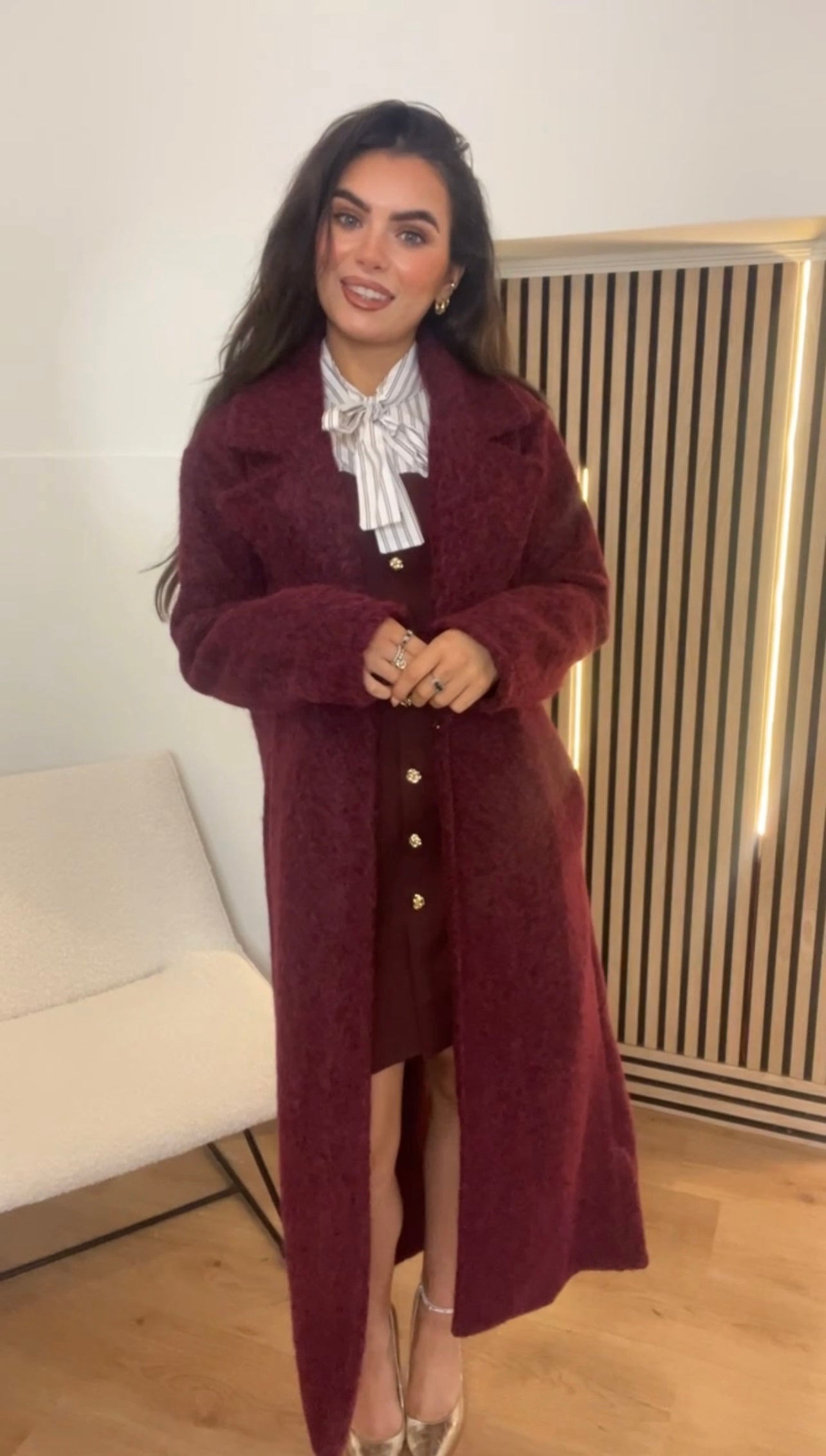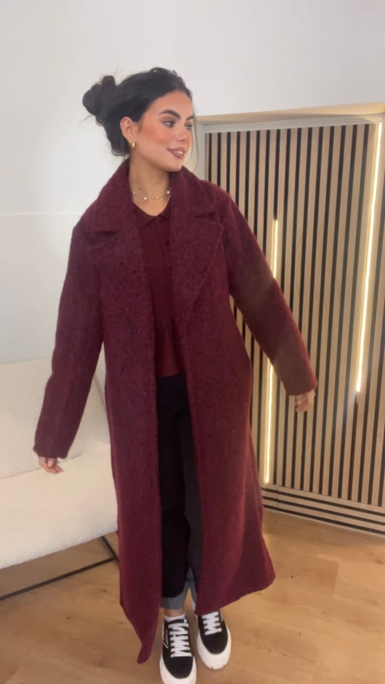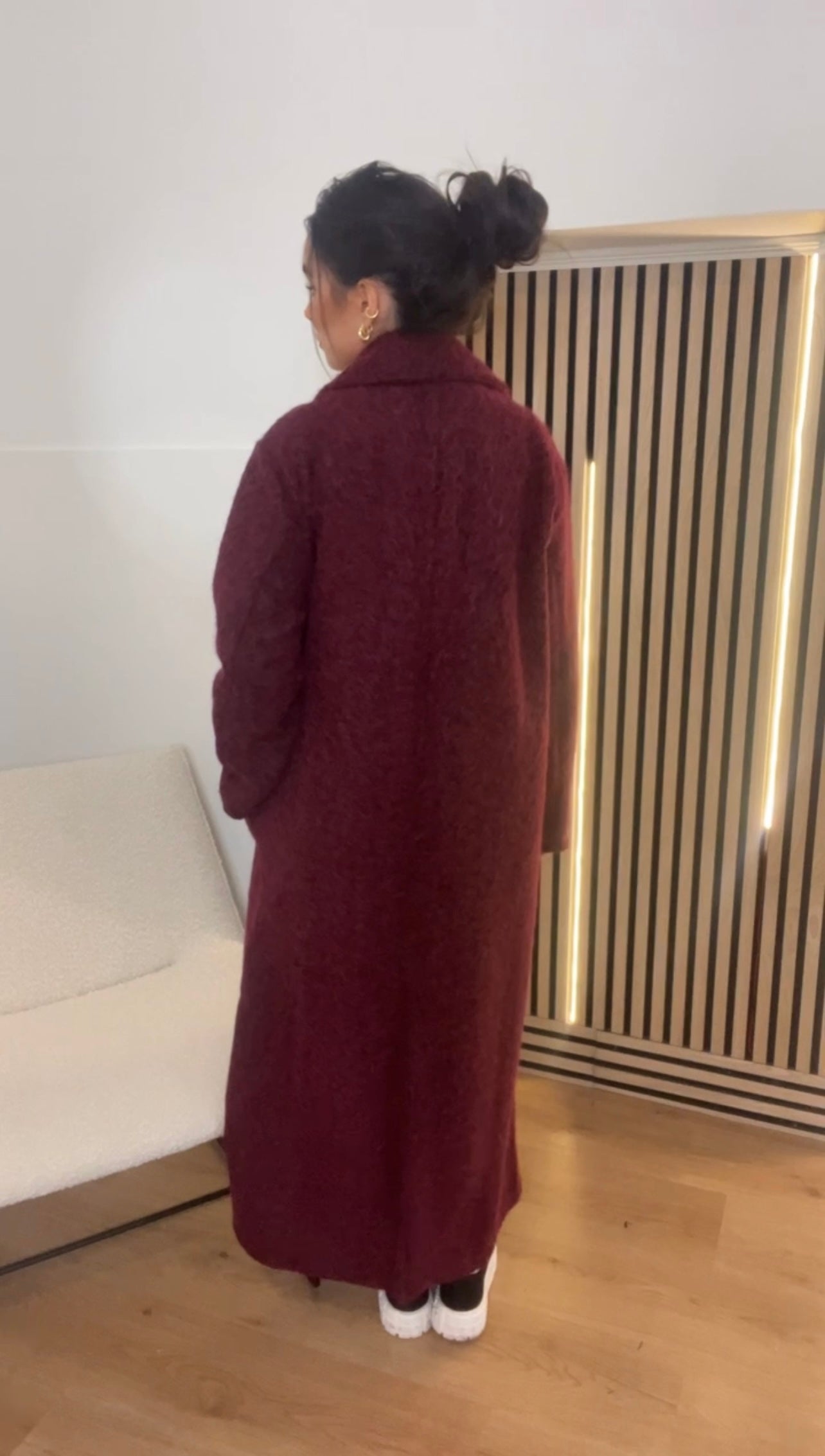 Luxuriously soft long line coat, with a soft brushed effect, back slit at hem, lapels for that added dressy look and hidden hook if you wish to close