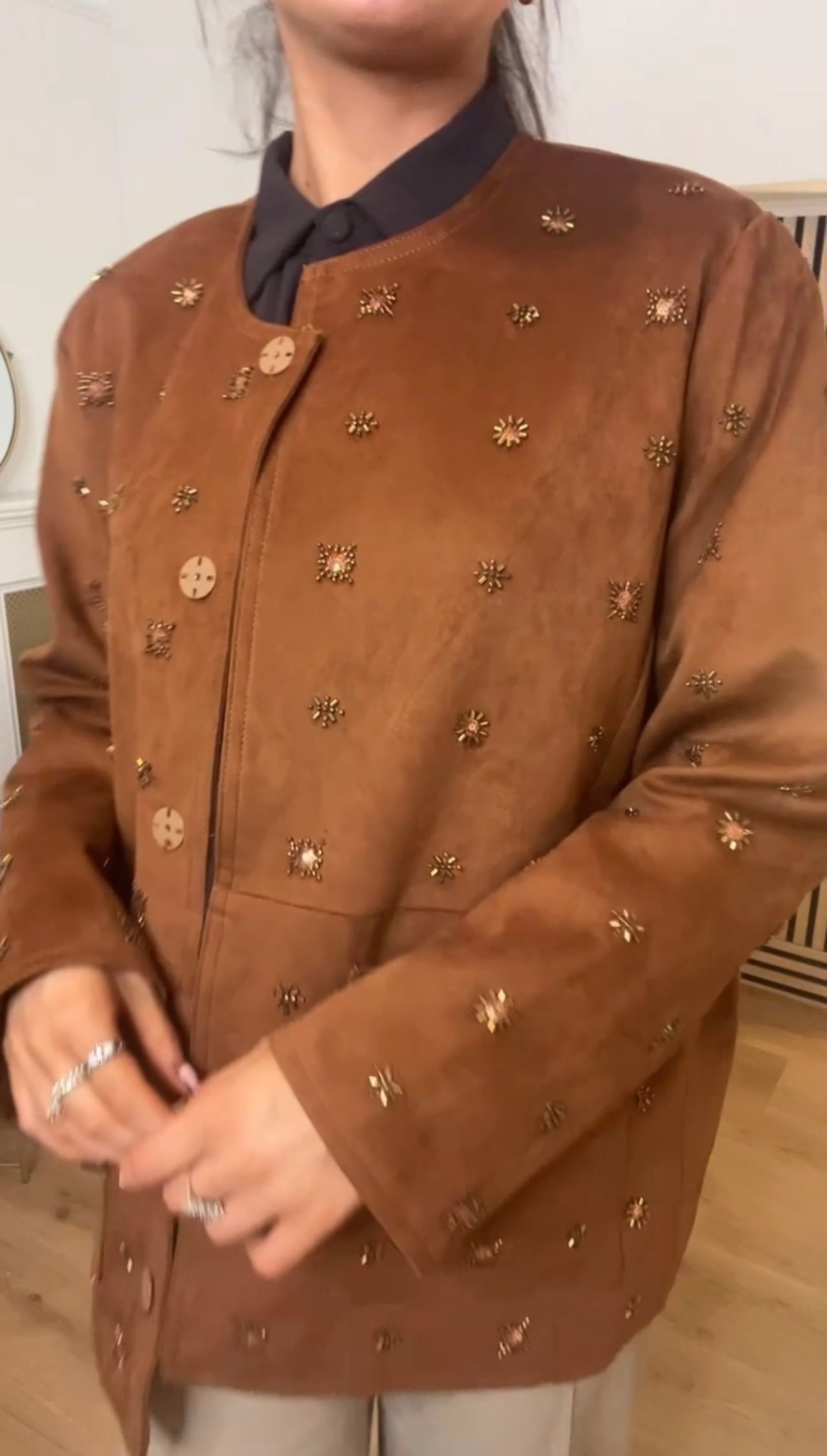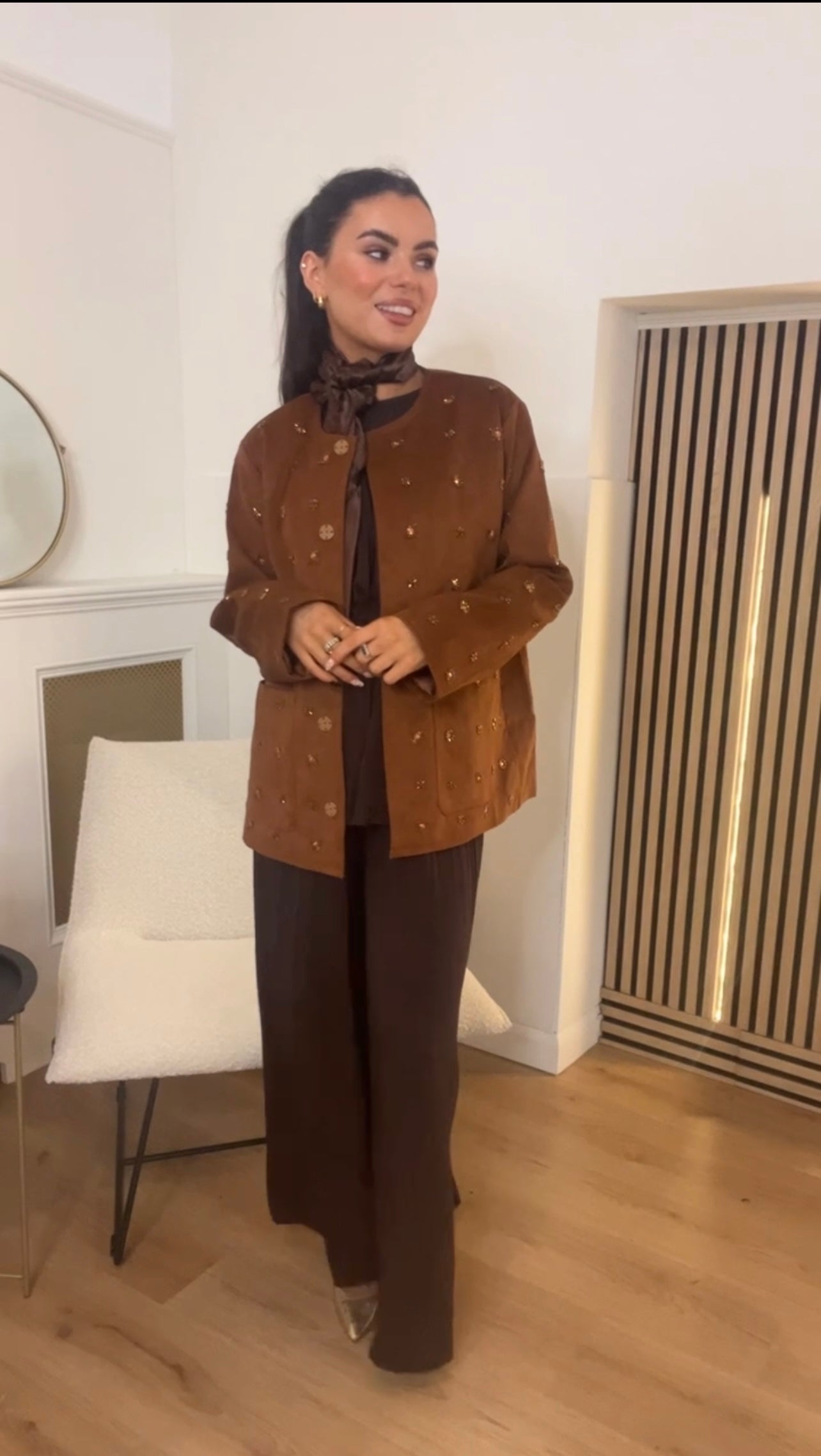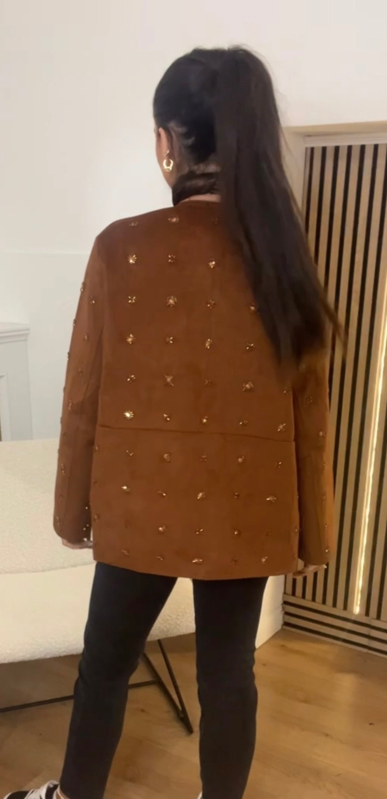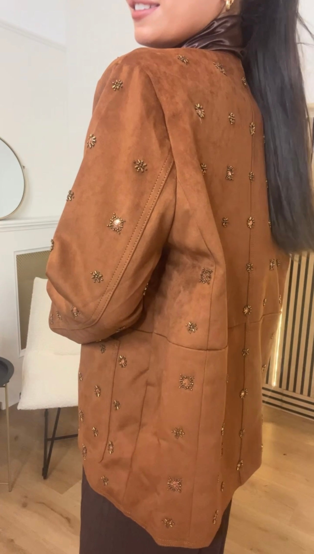 Tan faux suede style collarless jacket with flush popper style buttons for a clean and uninterrupted look front pockets and delicately enhanced with a mixture of bronze and gold beading scattered evenly all over, fully lined