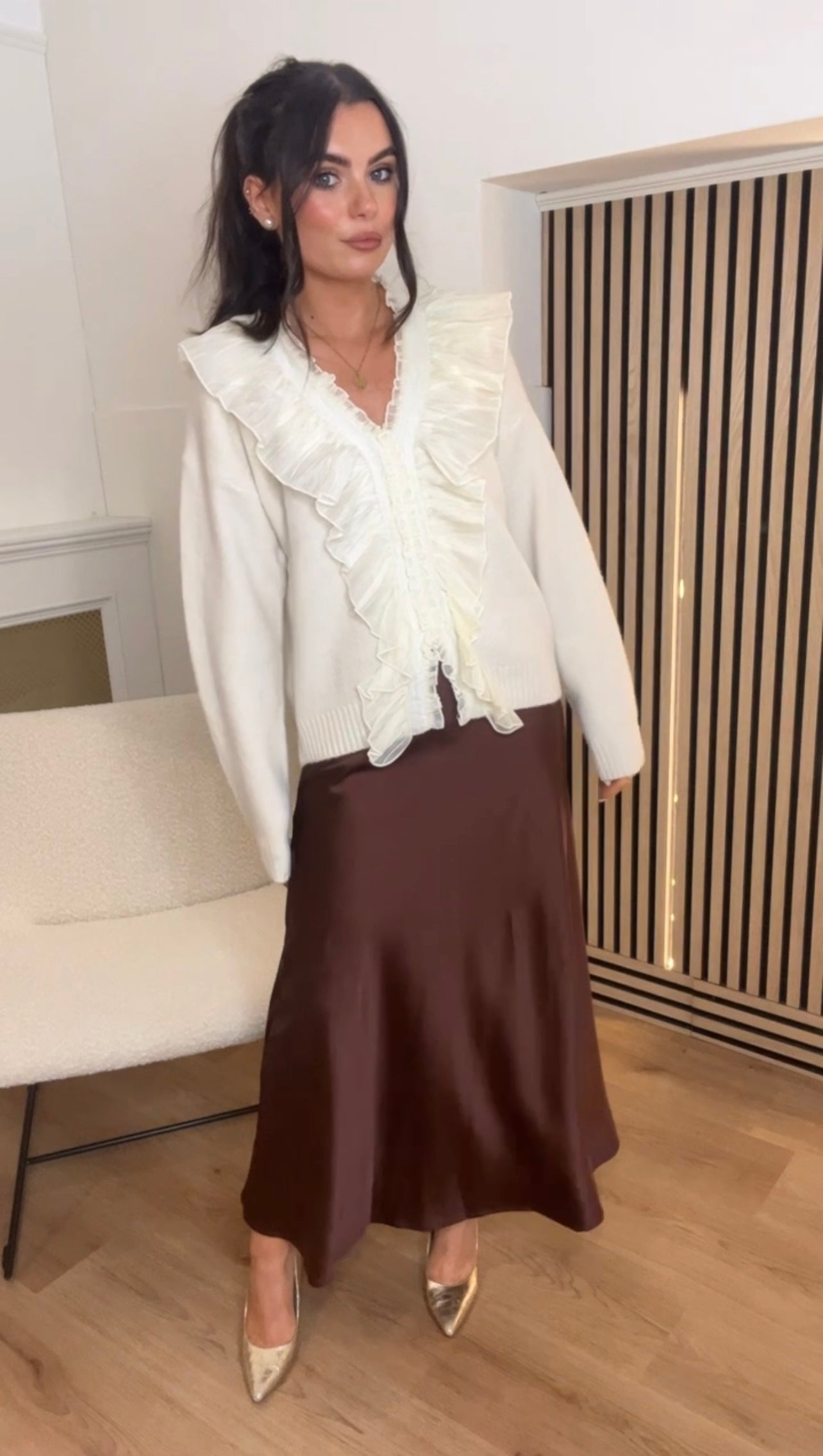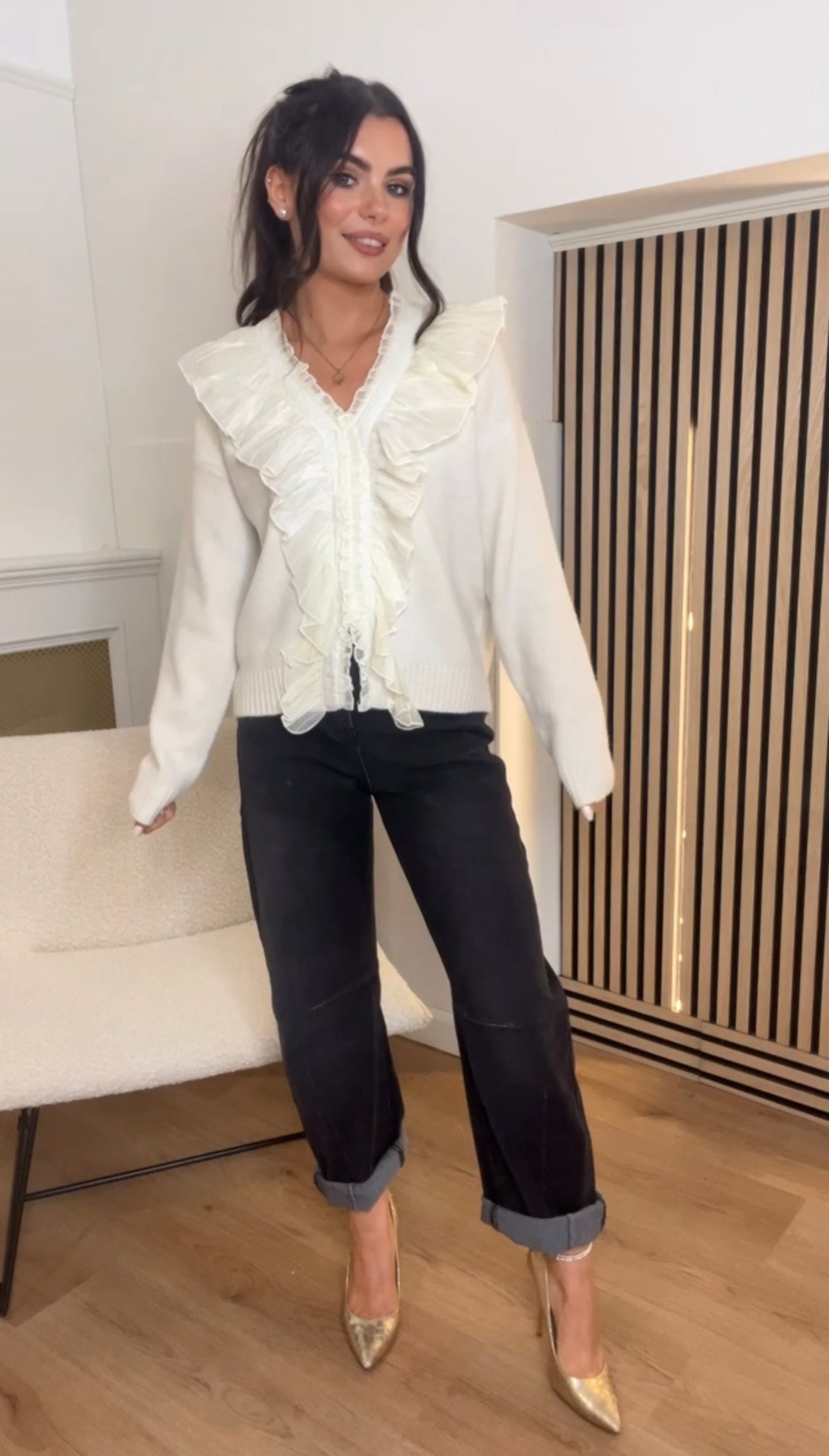 Soft knit cream jumper with v neck line and v split to front at hem, frill detail around neck and down front