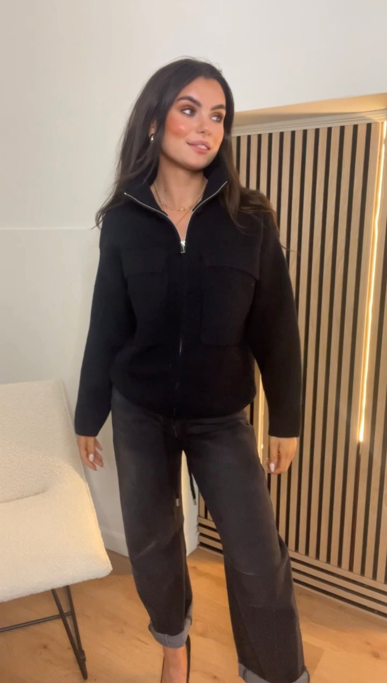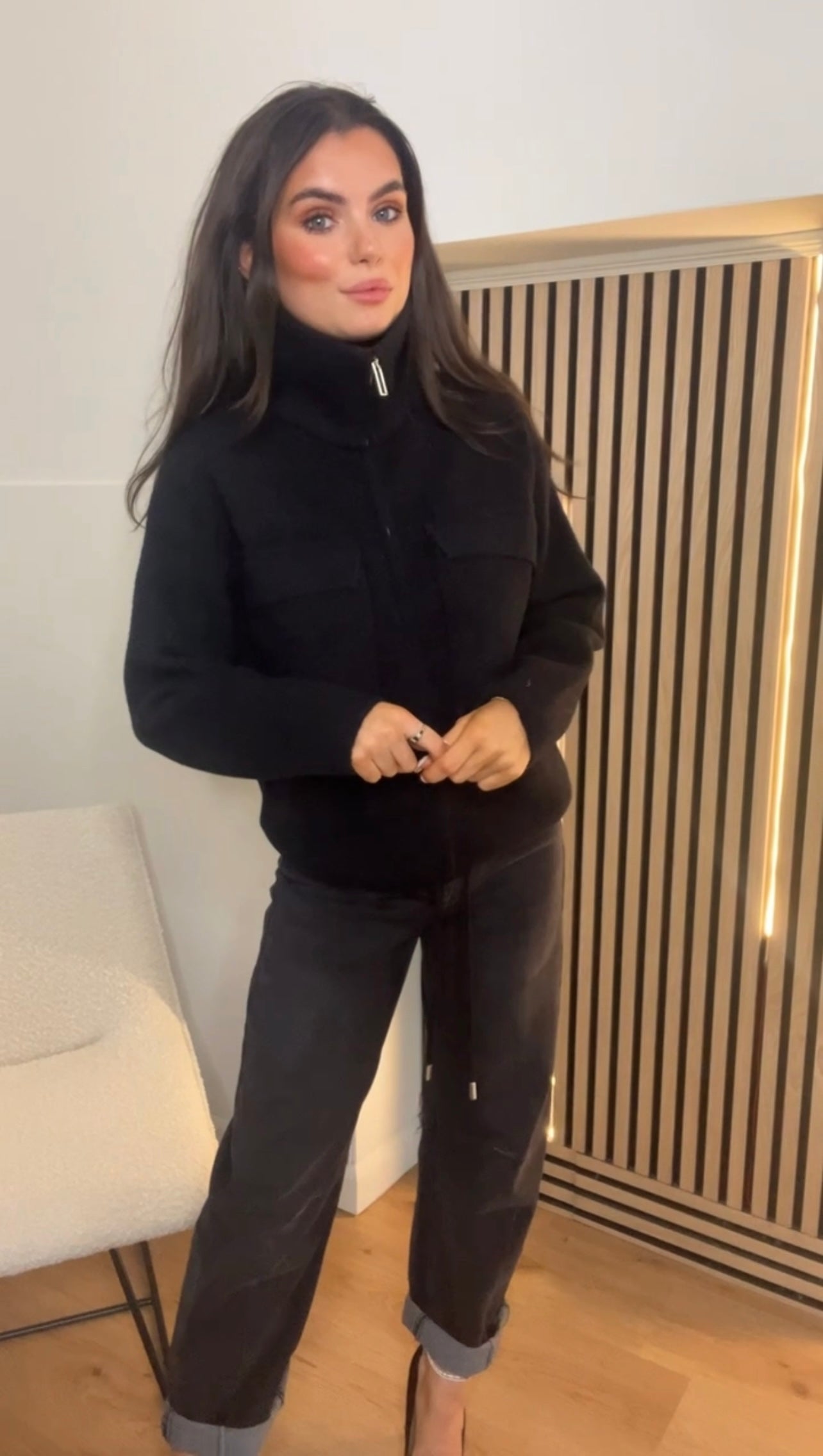 Soft knit jkt with front zip and pull tie hem, funnel neck and cargo style front, silver hardware