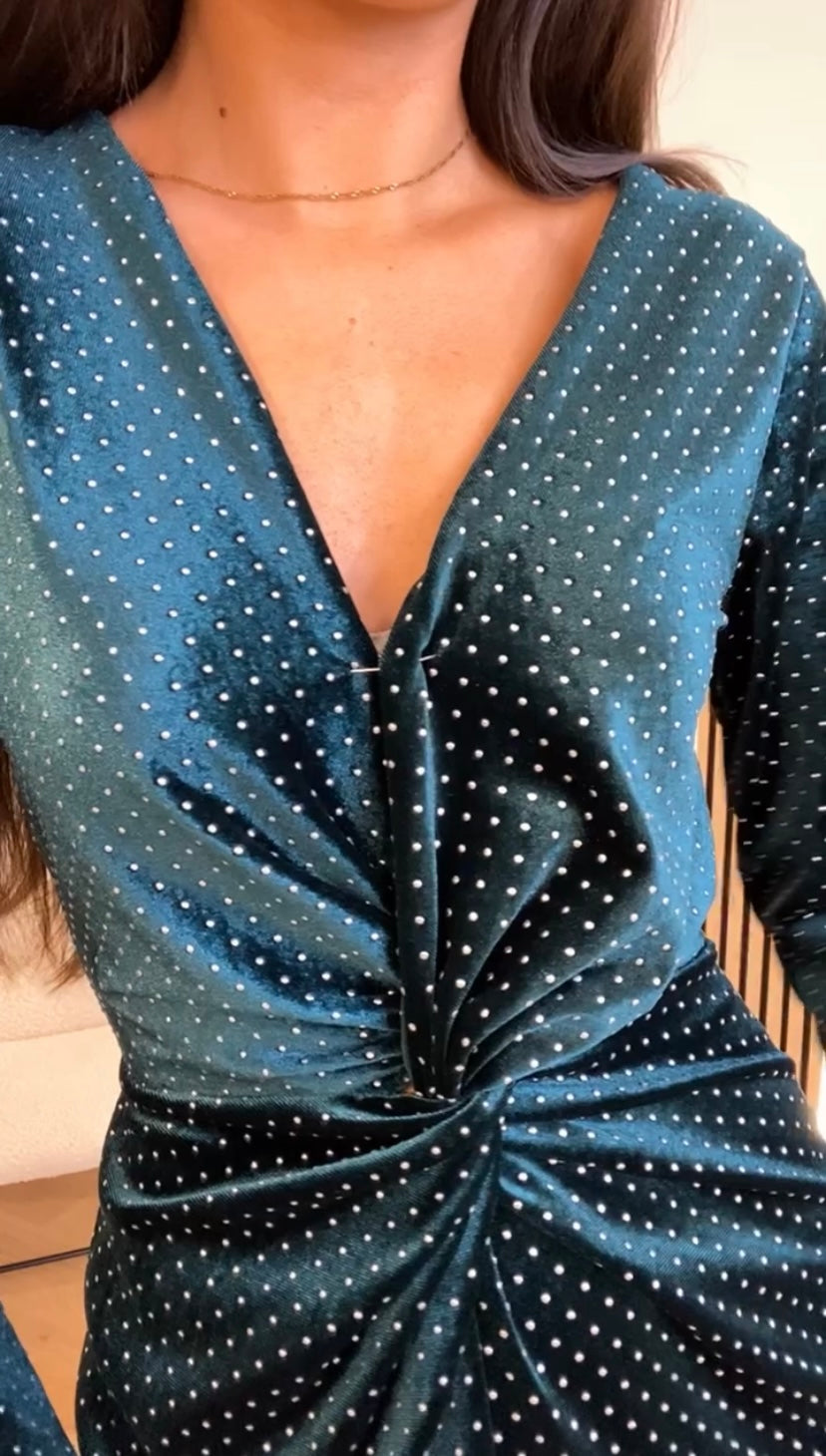 Forest green midi dress with plunge neckline and knot, sparkle embossed details, long sleeves, front split - stretch fabric and elastic waist to back for added comfort
