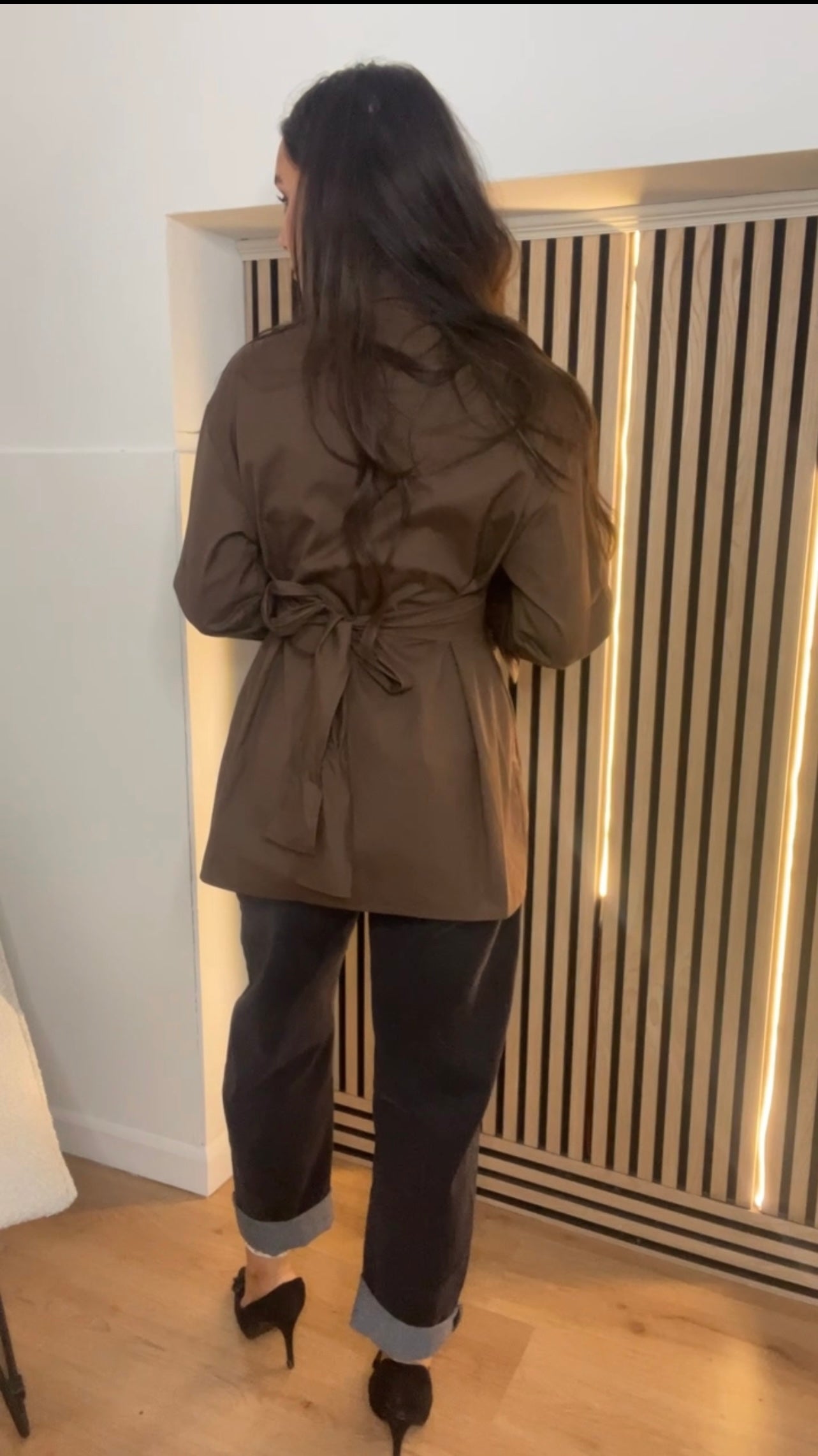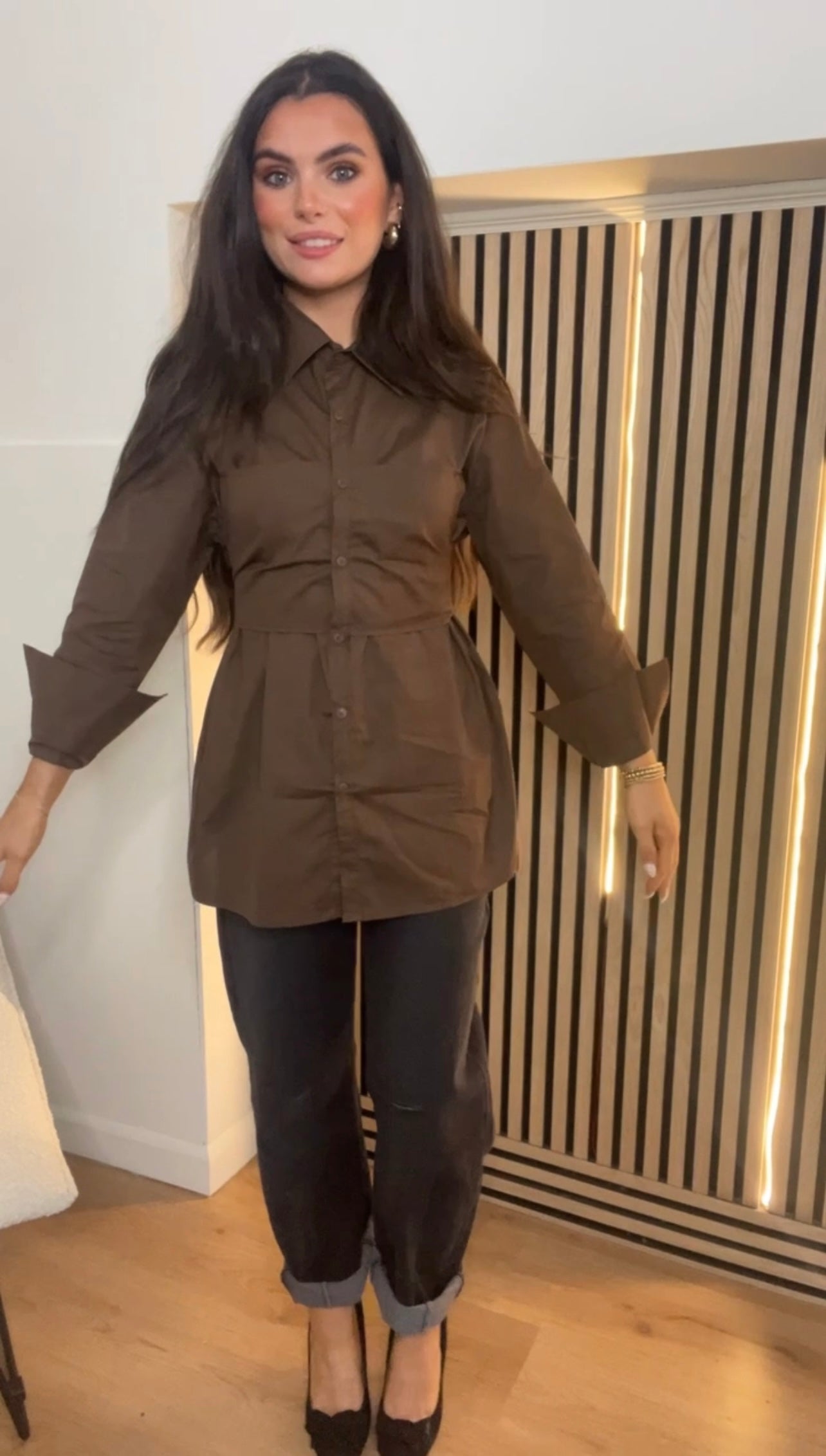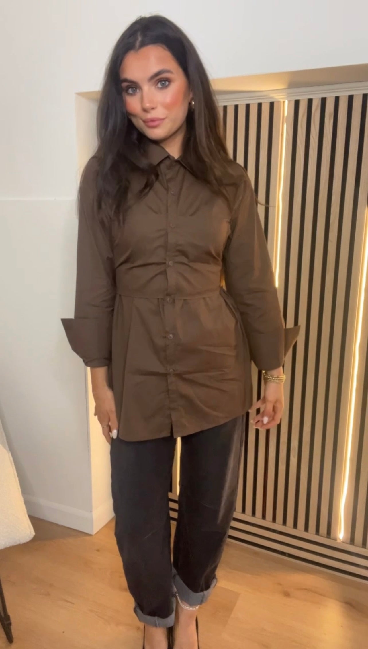 Chocolate Brown long line shirt with attached tie detail to back