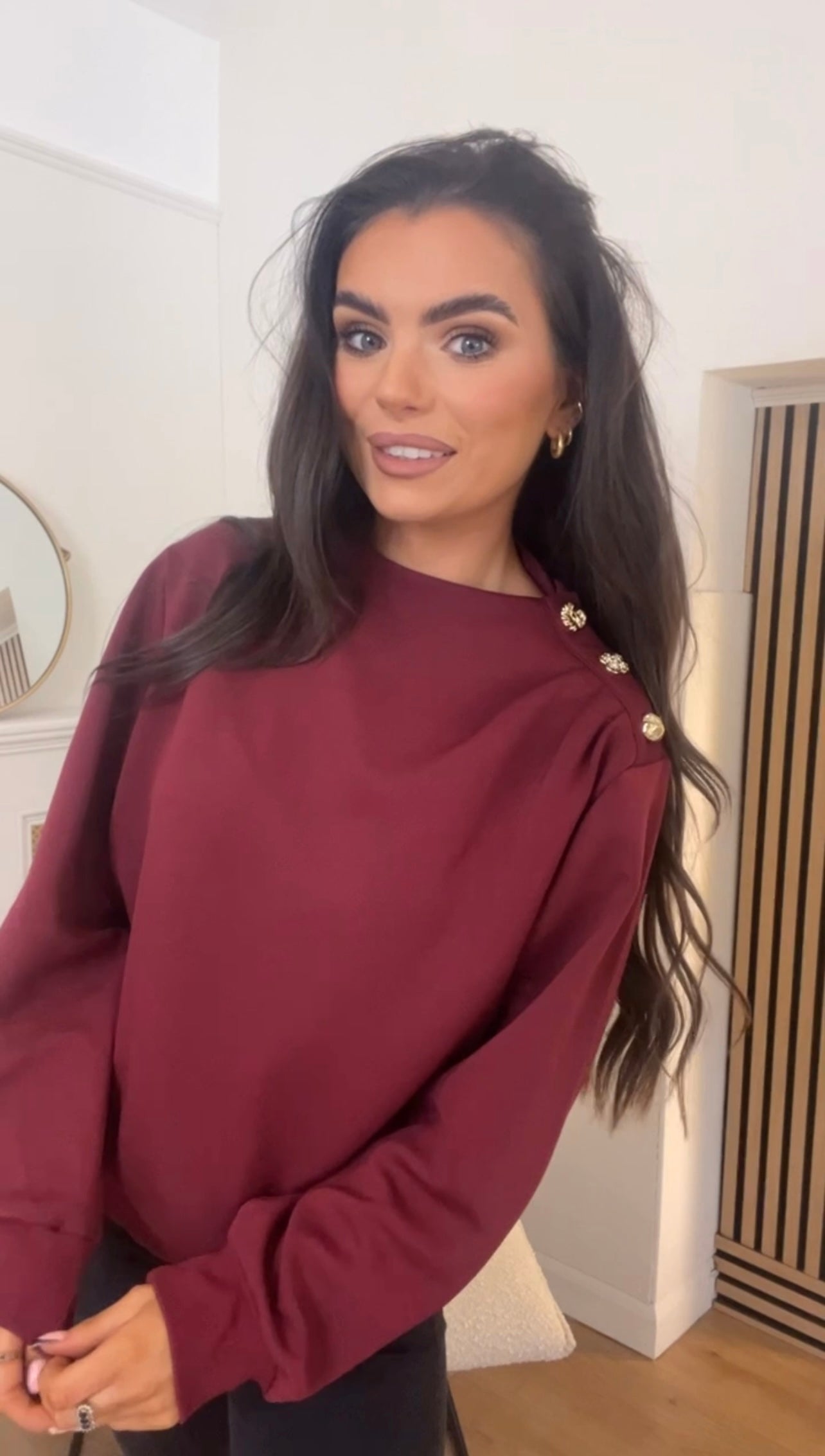 Burgandy red sweater with decorative gold button opening to shoulder with pleated detail, luxurious basics