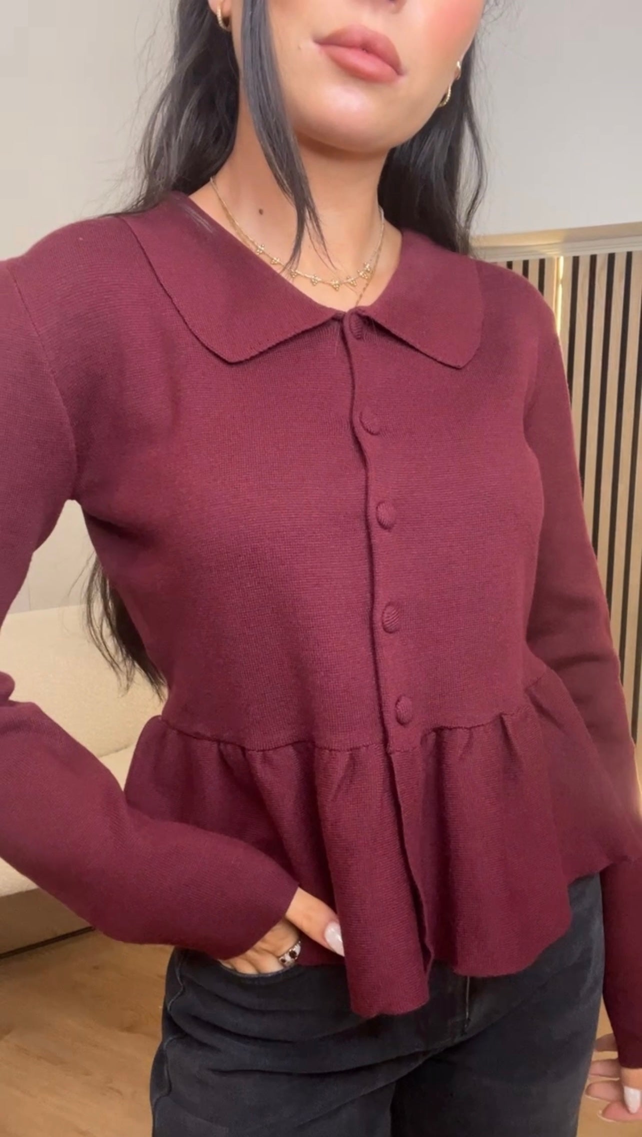 Peplum style Burgandy button front cardigan with collar, soft knited