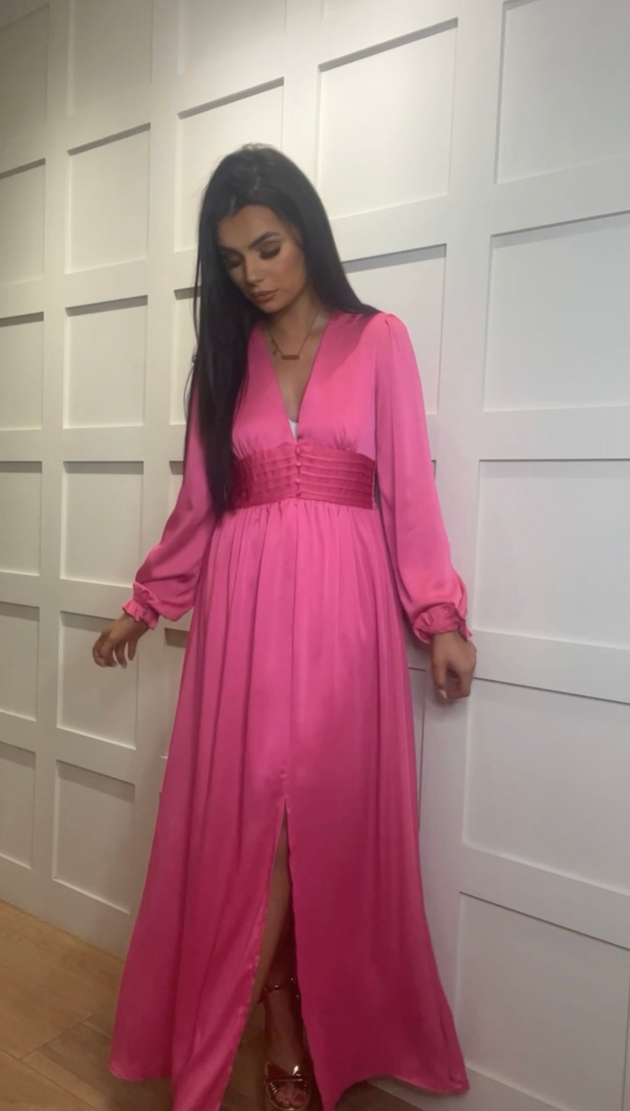 Vibrant fuchsia pink midi dress, v neck line with pleated waistband and button detailing, elastic waisted at back for extra comfort and shaping, long sleeve with elastic pleated cuff