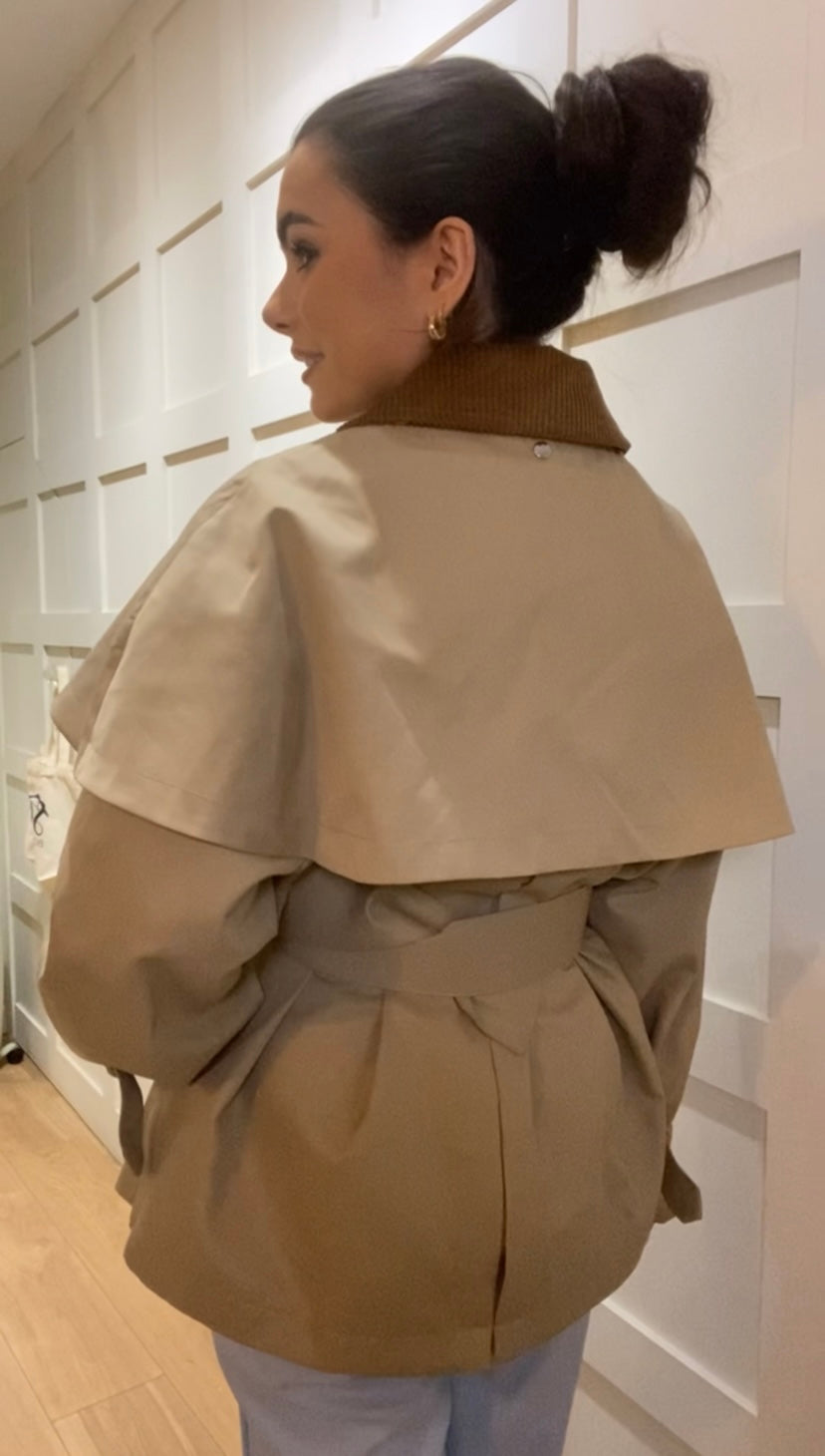 Beige coloured lined short trench style jacket with tan corduroy collar, detachable cape, pleated detailing to back buckle belts to waist and cuffs, popper stainless steel buttons , front pockets