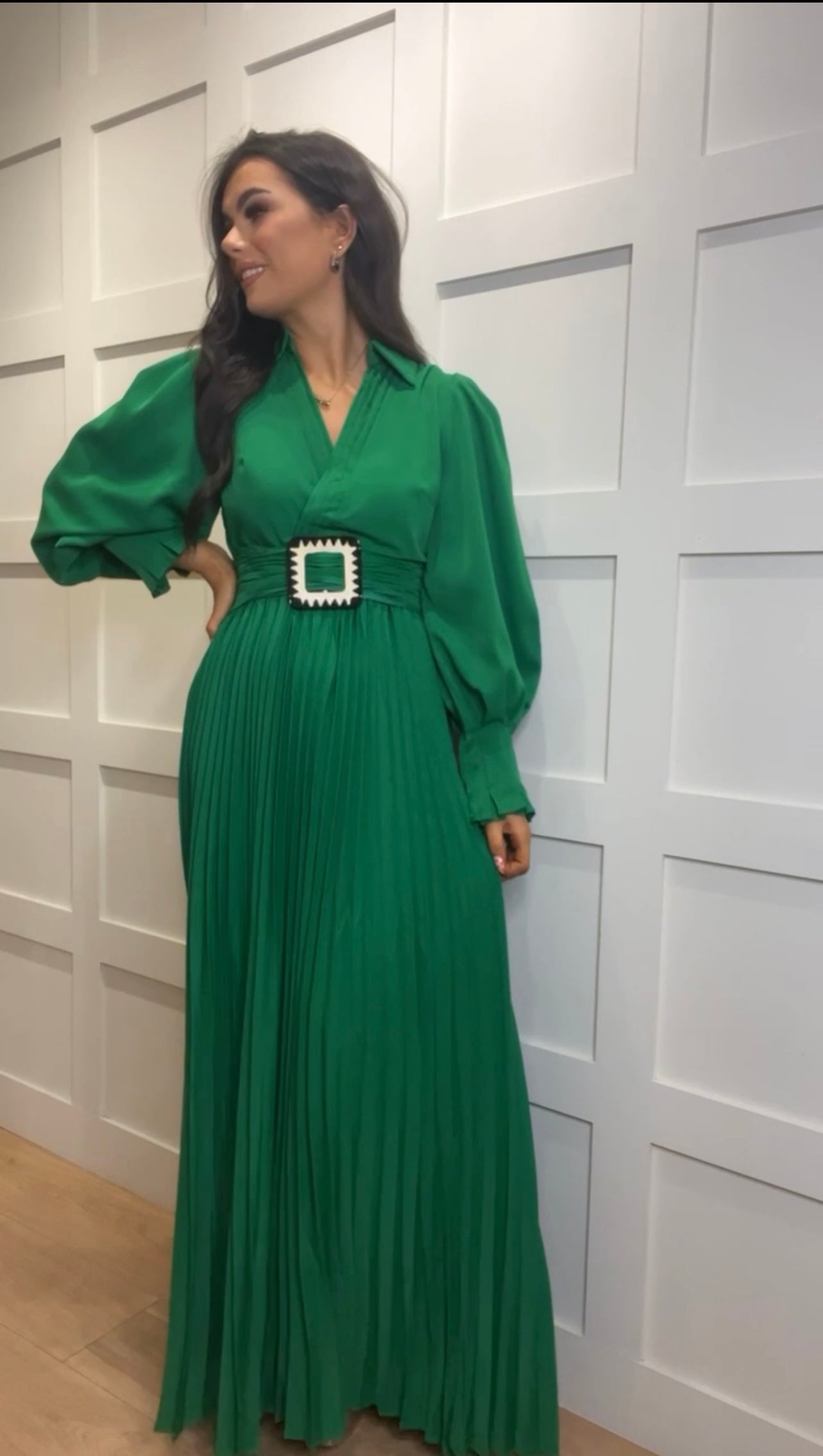 Emerald Green maxi dress, v neck with pleated detail, collar, back zip opening with elastic to waist at back for added comfort, attached belt, pleated skirt, deep pleated cuff
