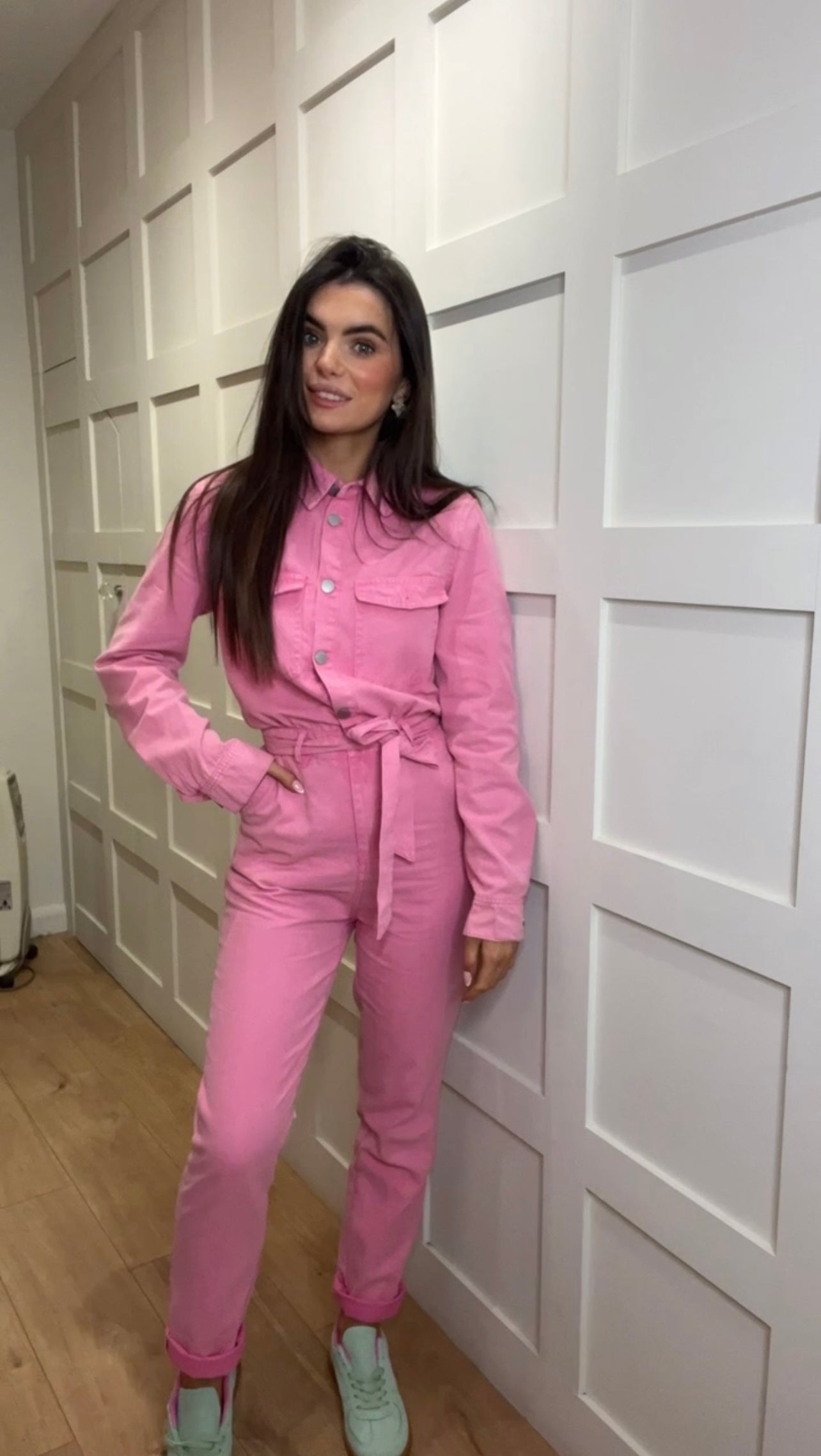 Soft denim jumpsuit pockets to front, tie belt, button front and collar