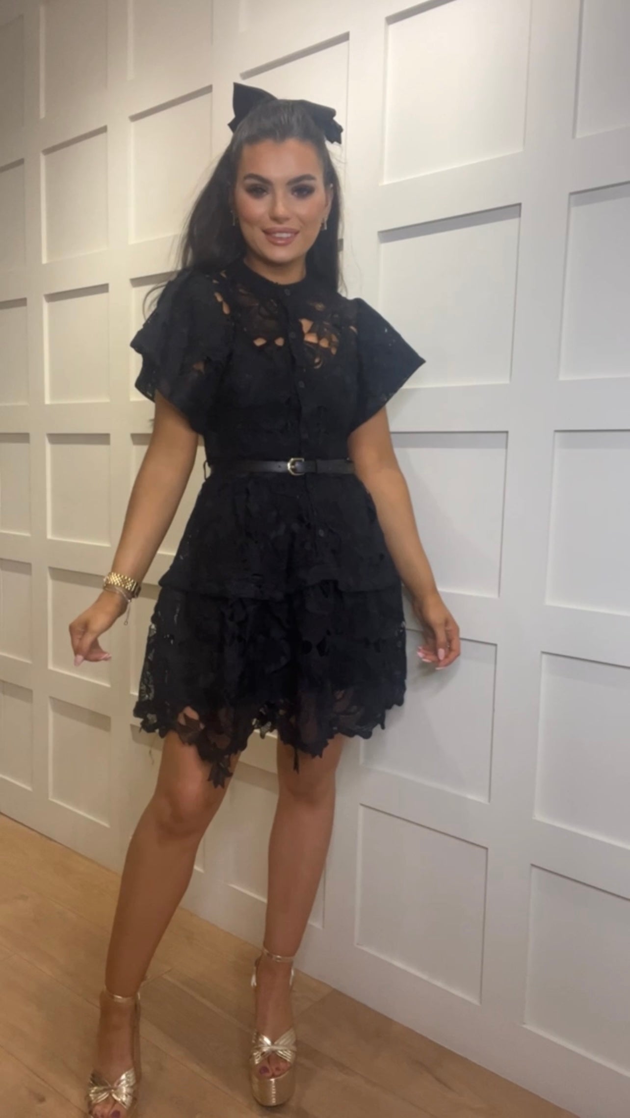 Black embroidery lace dress, separate under slip, granda style collar, full button front, belted, puff short sleeve, scalloped hem